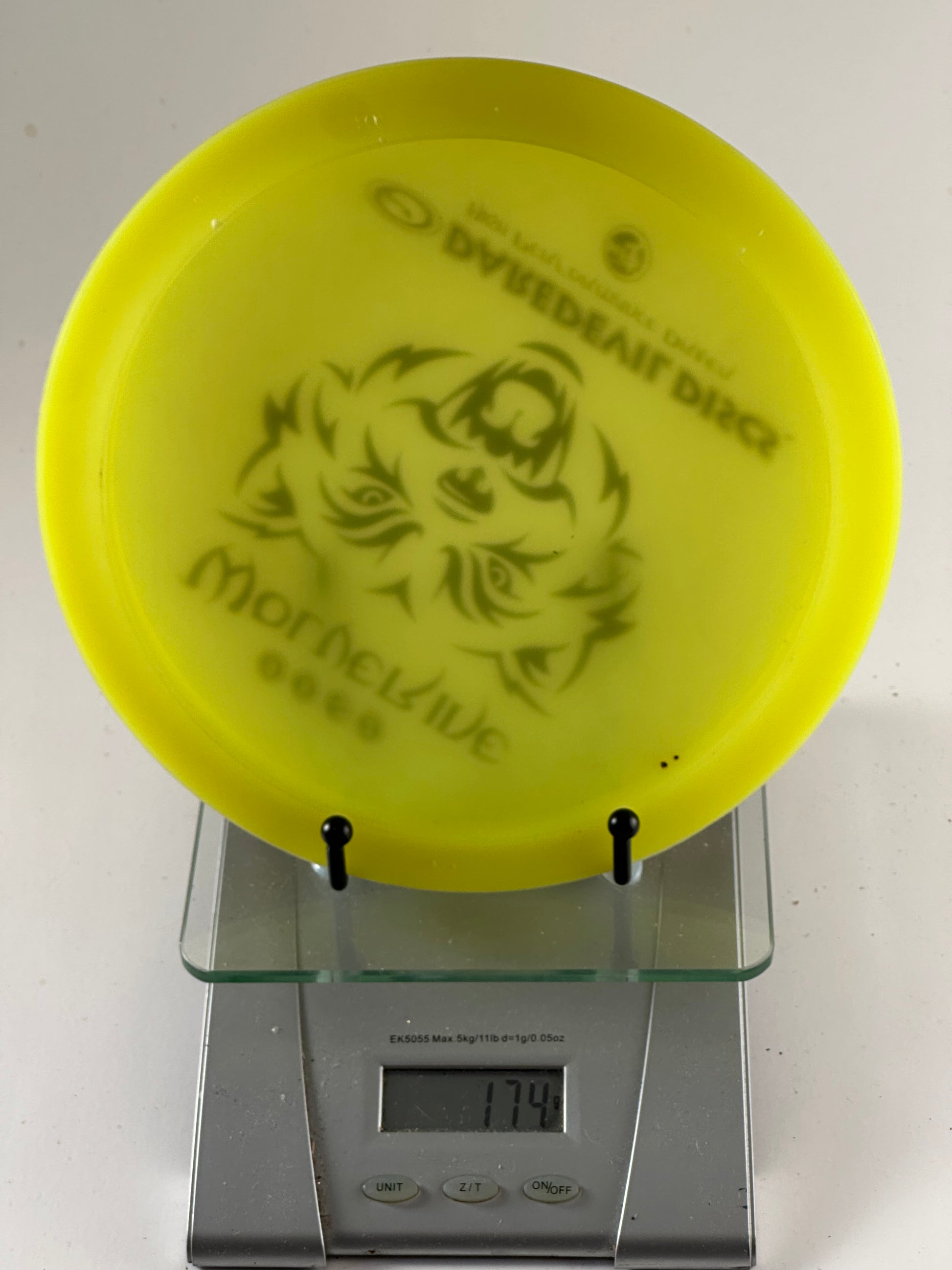 Daredevil Discs Wolverine in High Performance (HP) plastic, a controllable distance driver with flight numbers 9/5/-2/2. Bright yellow with wolverine head stamp; good option for hyzer-flips and workable S-lines.