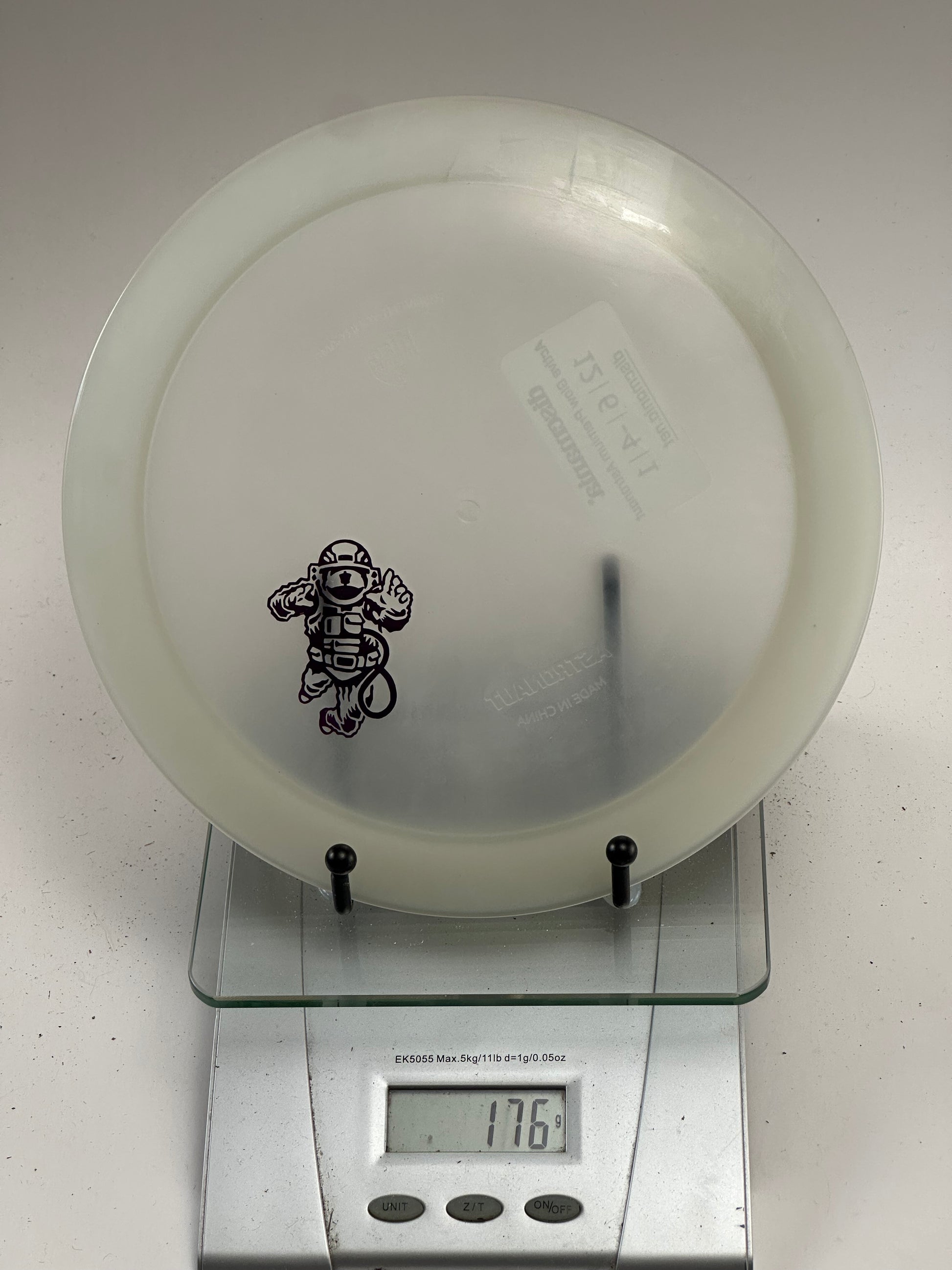 Discmania Astronaut distance driver in durable Active Glow Premium plastic, featuring a glow-in-the-dark translucent white appearance and astronaut stamp. Weighs 176 grams and is ideal for maximizing distance on the course.
