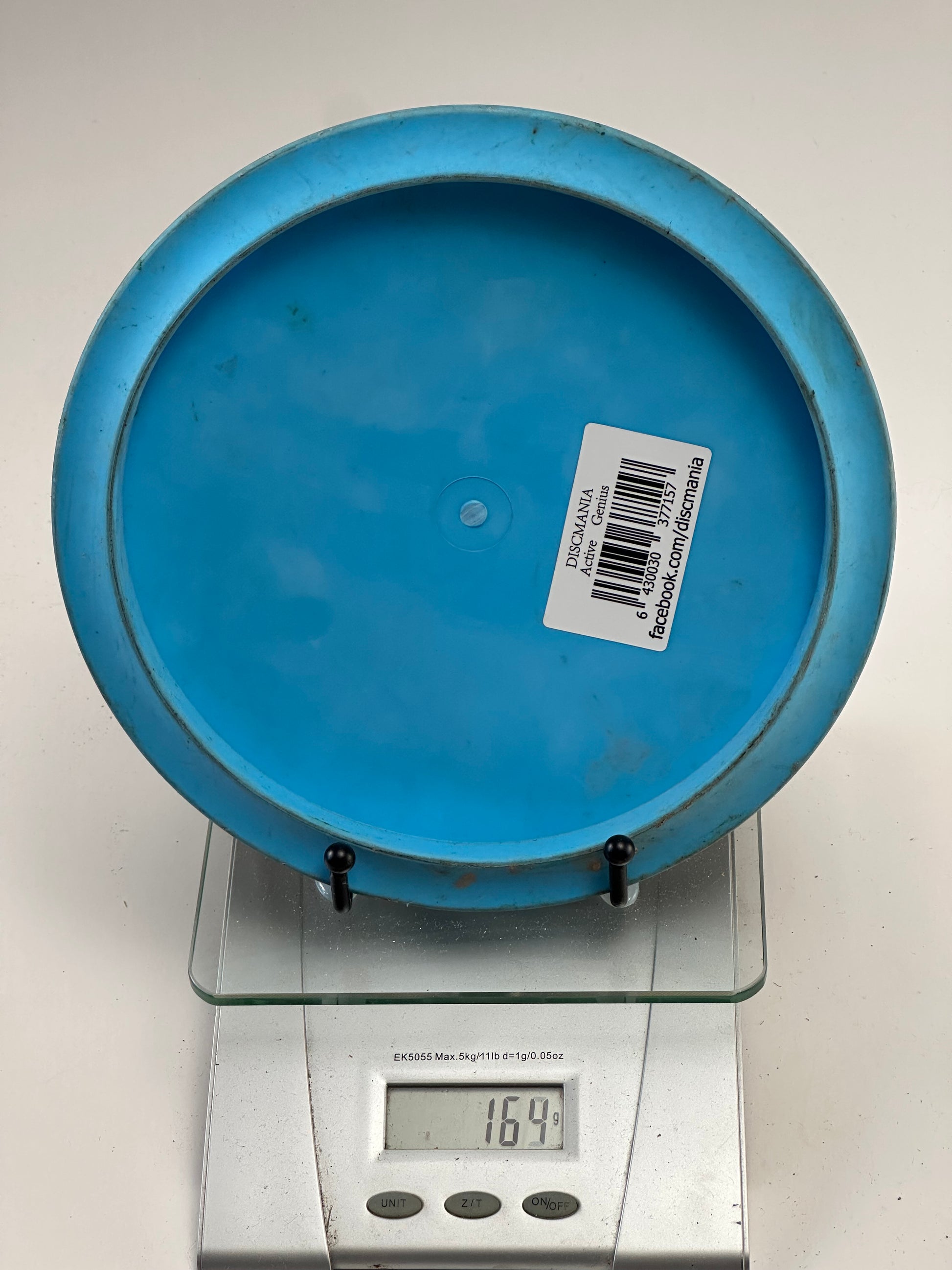 This is a blue Discmania Genius driver in Active plastic, designed for beginner to intermediate players. The disc shows visible signs of use but remains in solid playable condition. Weight is marked at 163 grams.