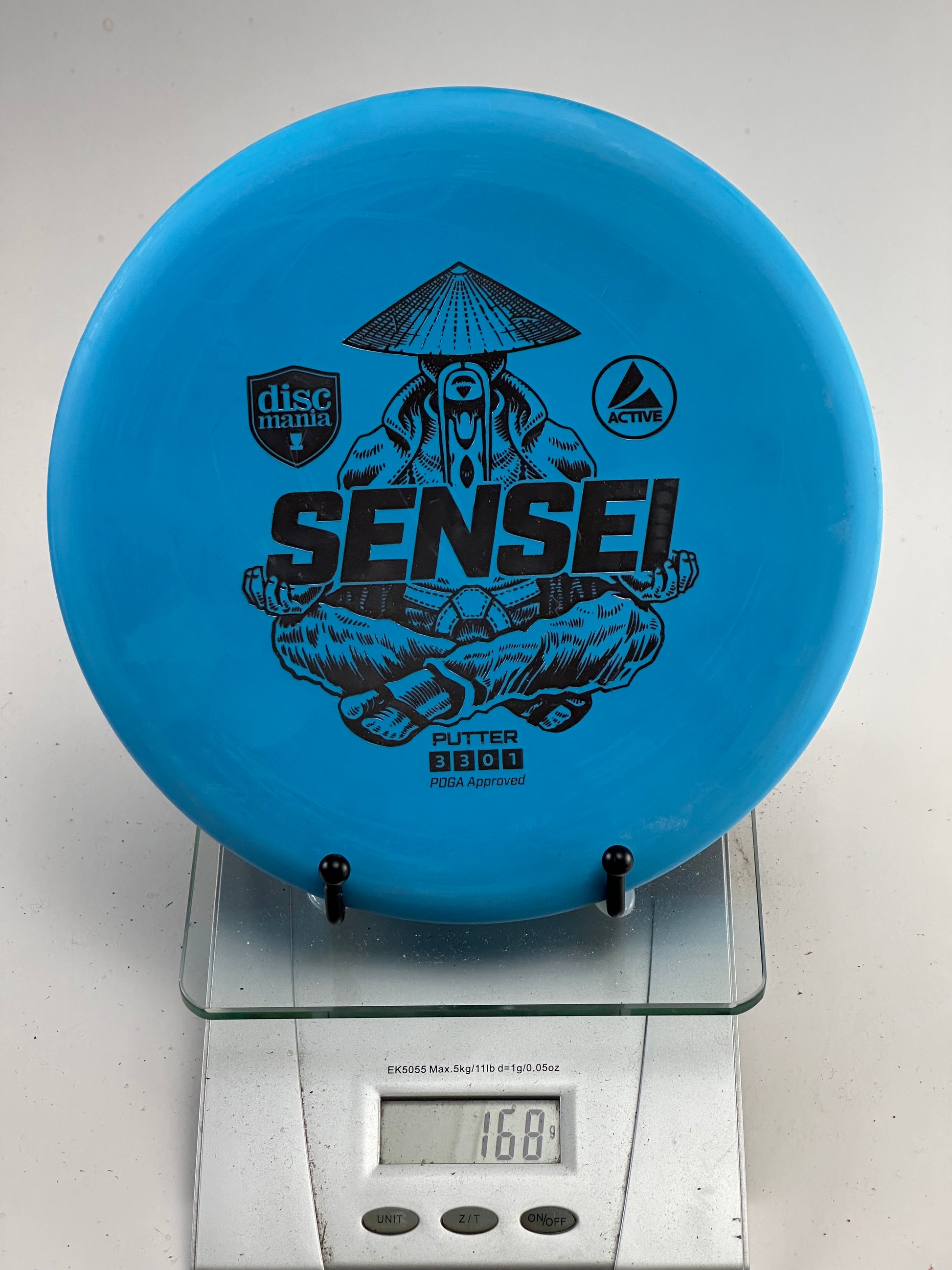 Bright blue Discmania Sensei putter in durable Active Base plastic. Features the signature Sensei stamp and offers a comfortable feel for putting and approach shots.