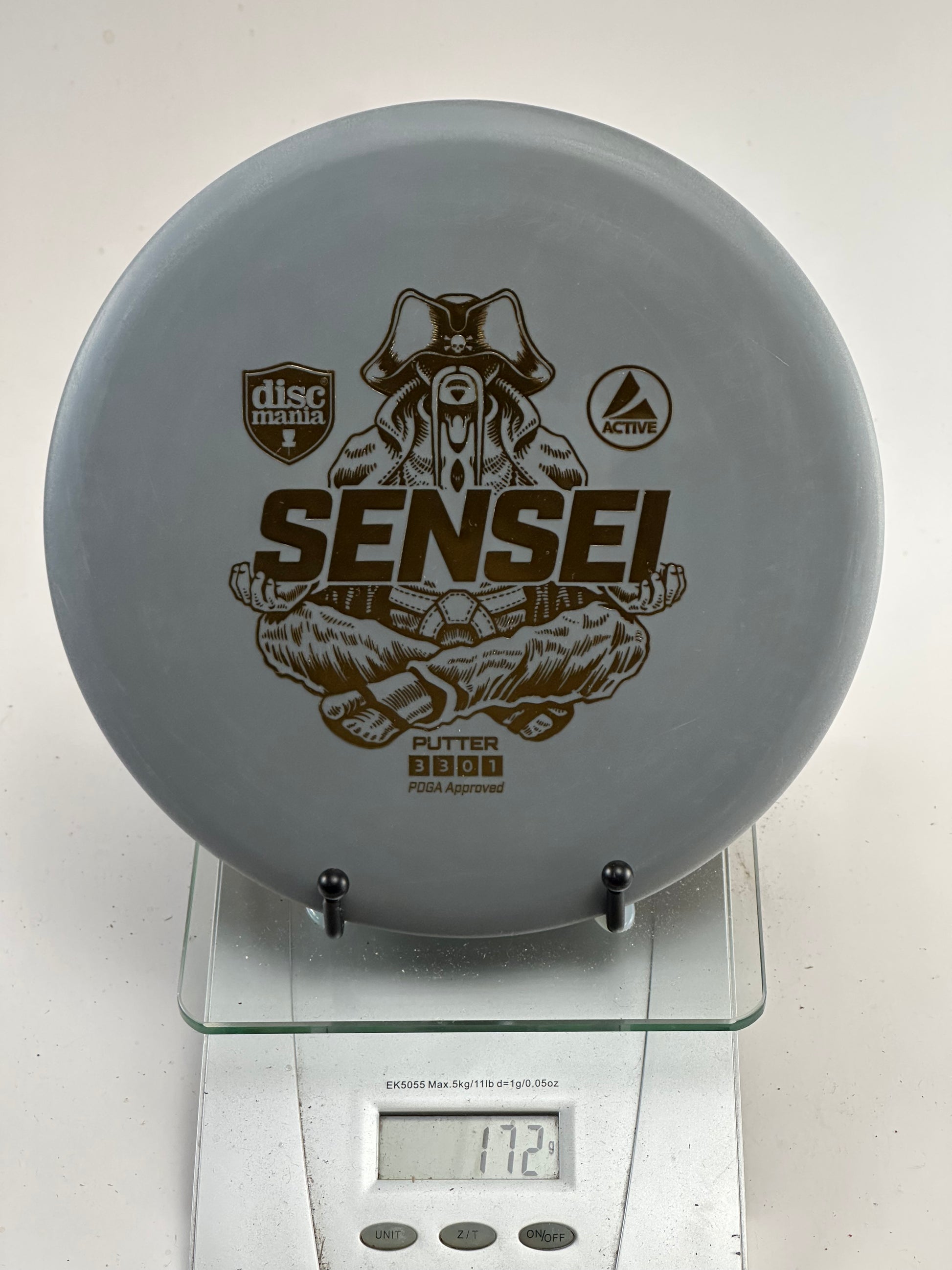 Discmania Sensei putter in gray Active Base plastic. The disc has a clean pirate-themed stamp and is in great condition.