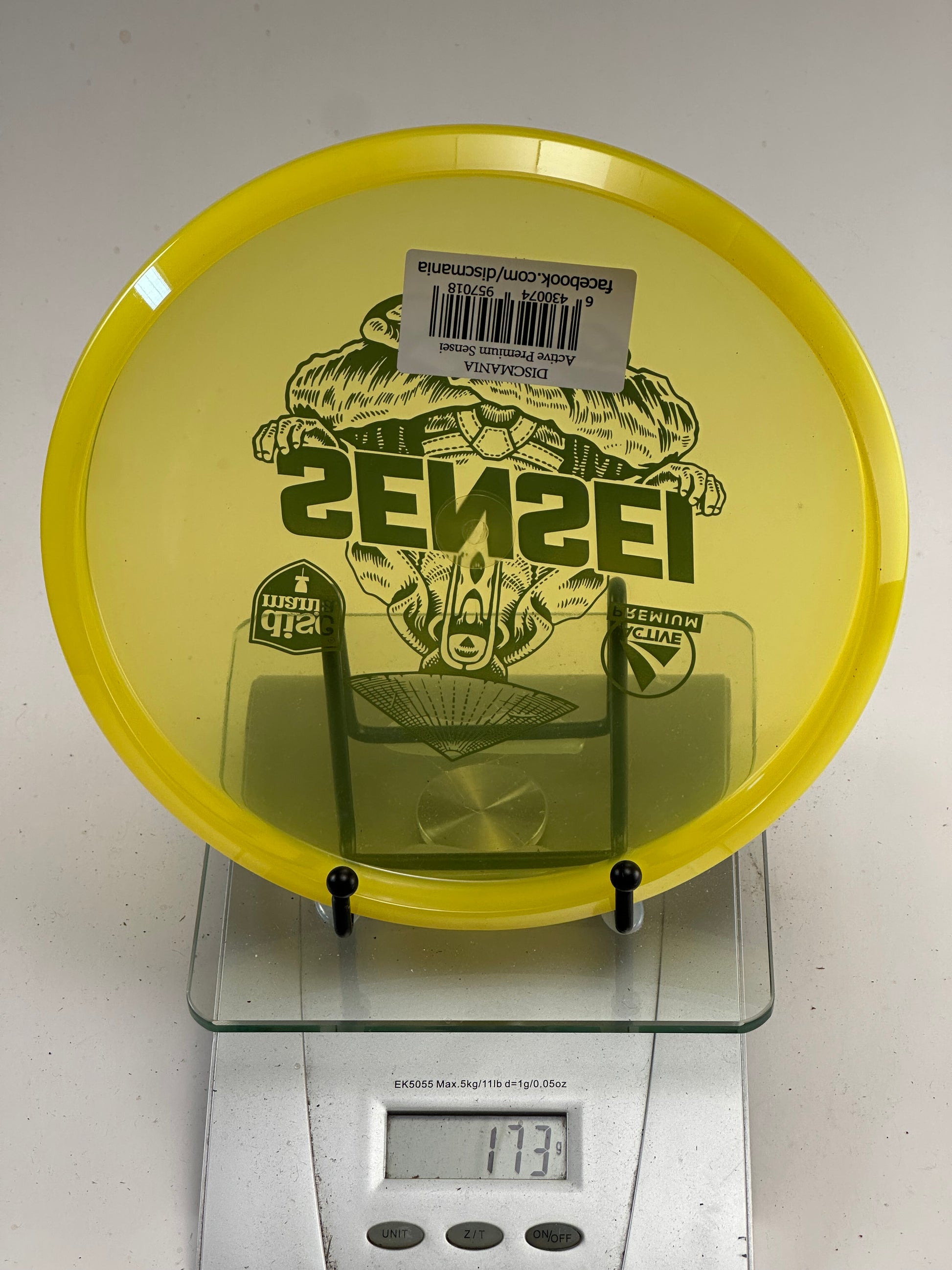 Discmania Sensei putter in durable yellow Active Premium plastic. 173g weight, featuring the distinct Sensei stamp art. Great for putts and approach shots with a premium feel.