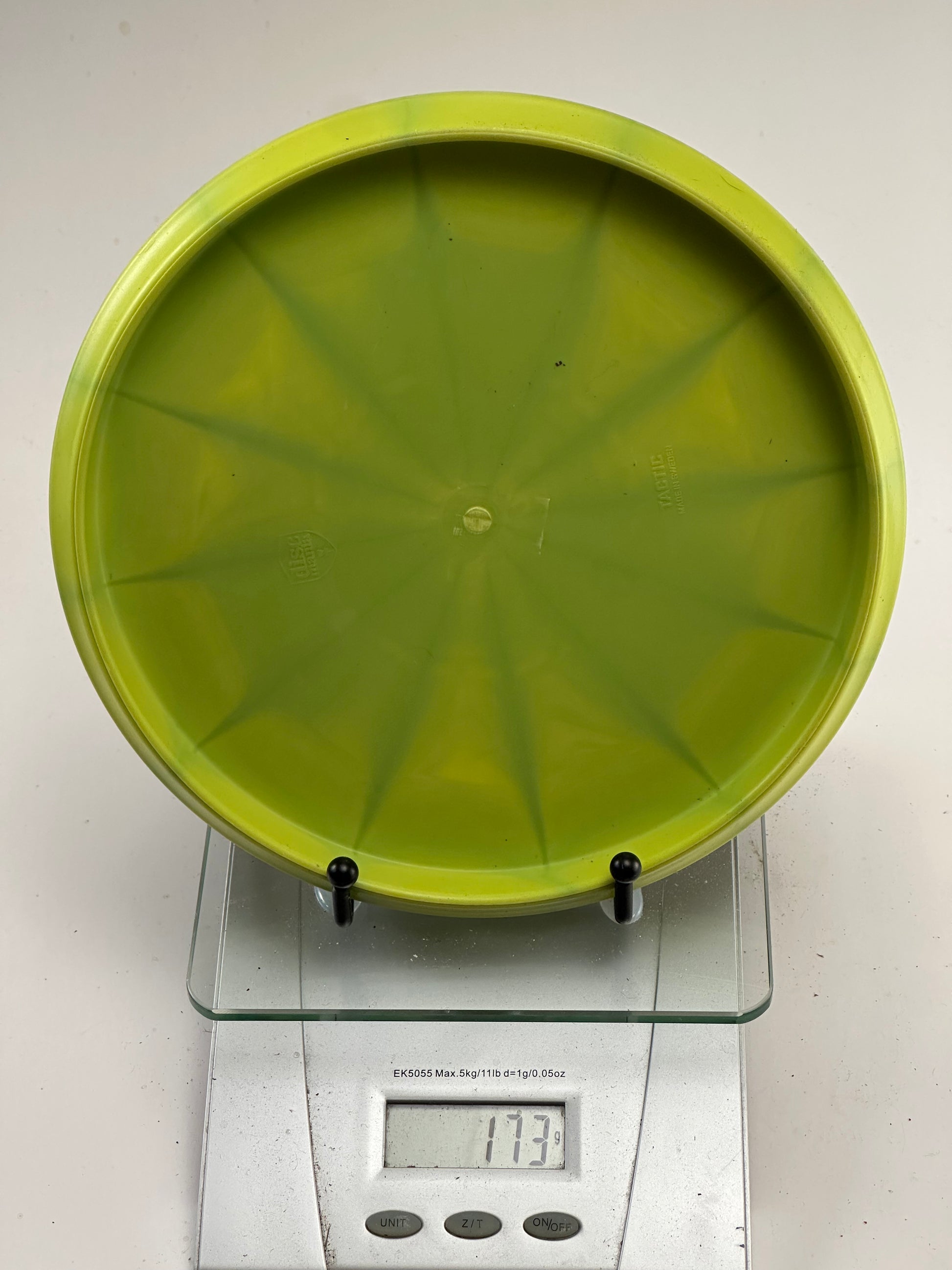 This is a Discmania Evolution Tactic in the 2022 Special Edition Extra Soft Exo Vapor plastic. The disc features a bright yellow color and has a weight of 173g. It appears to be in excellent condition with minimal visible wear.