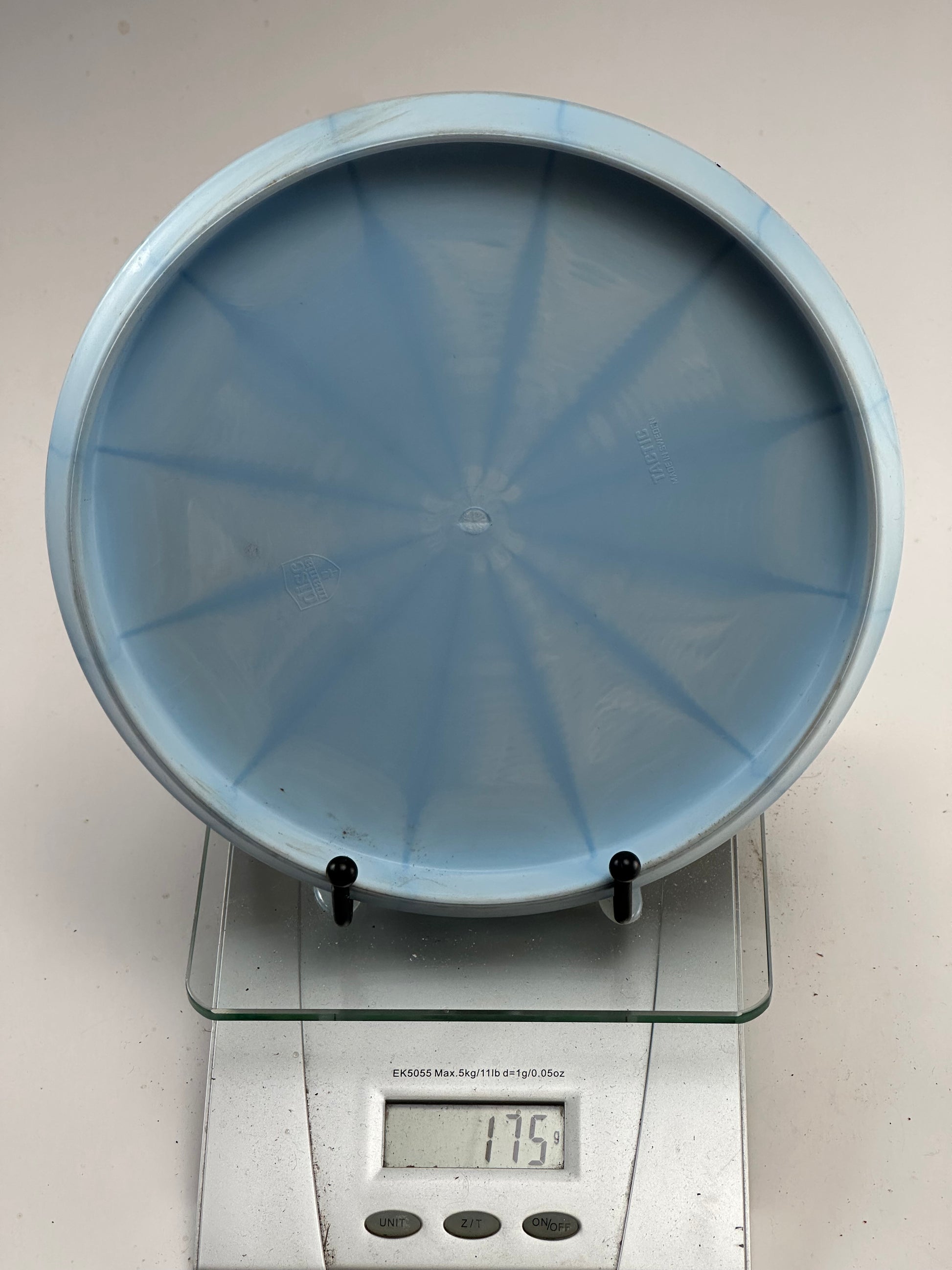 Discmania Evolution Tactic in Extra Soft Exo Vapor plastic, 2022 Special Edition with a light blue burst pattern. This premium approach disc is in excellent used condition and weighs 175 grams.