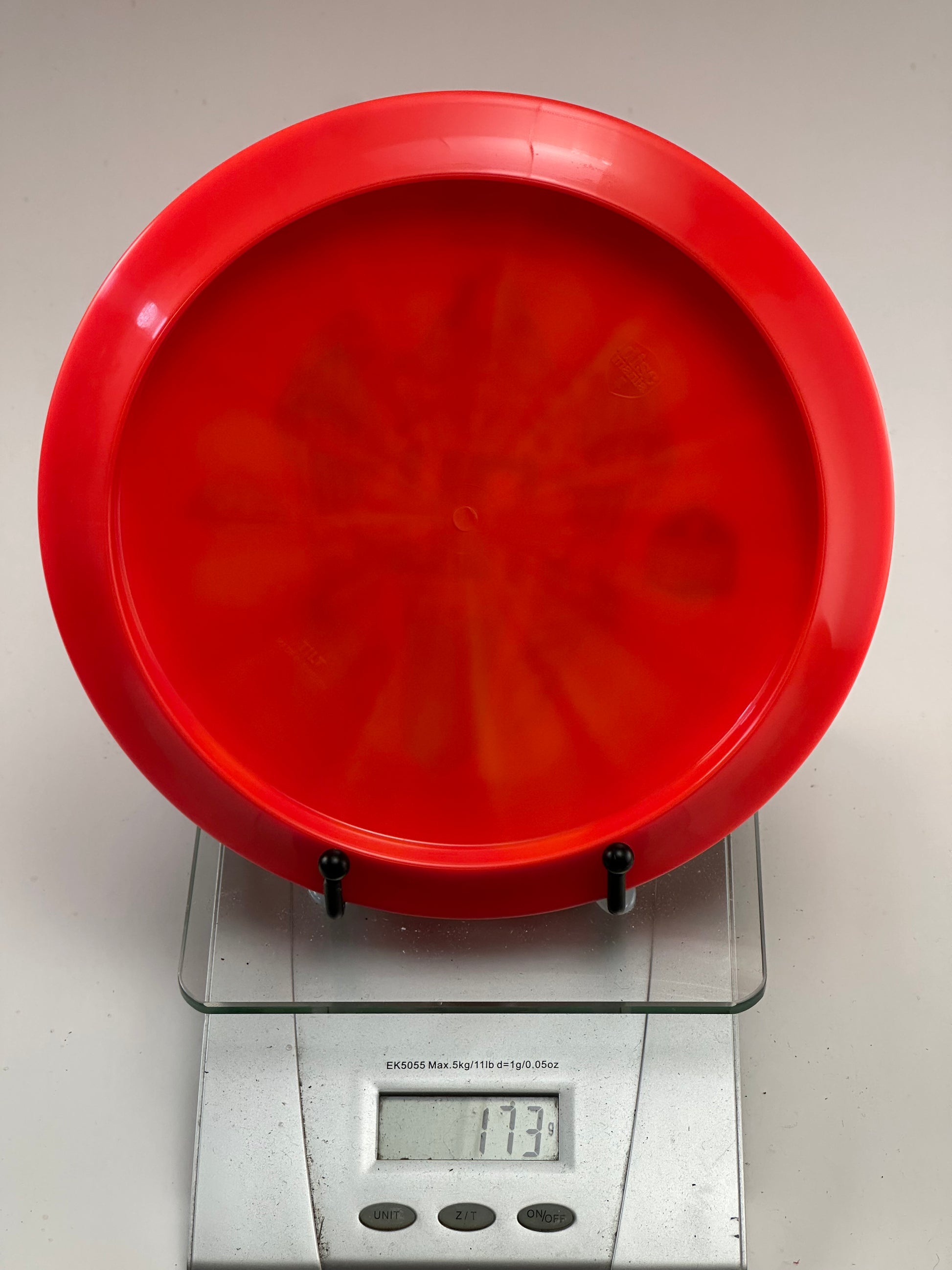 This is a Discmania Tilt in Lux Vapor plastic from the Simon Lizotte Creator Series. The disc features a vibrant red color with a colorful holographic stamp and weighs 173 grams.
