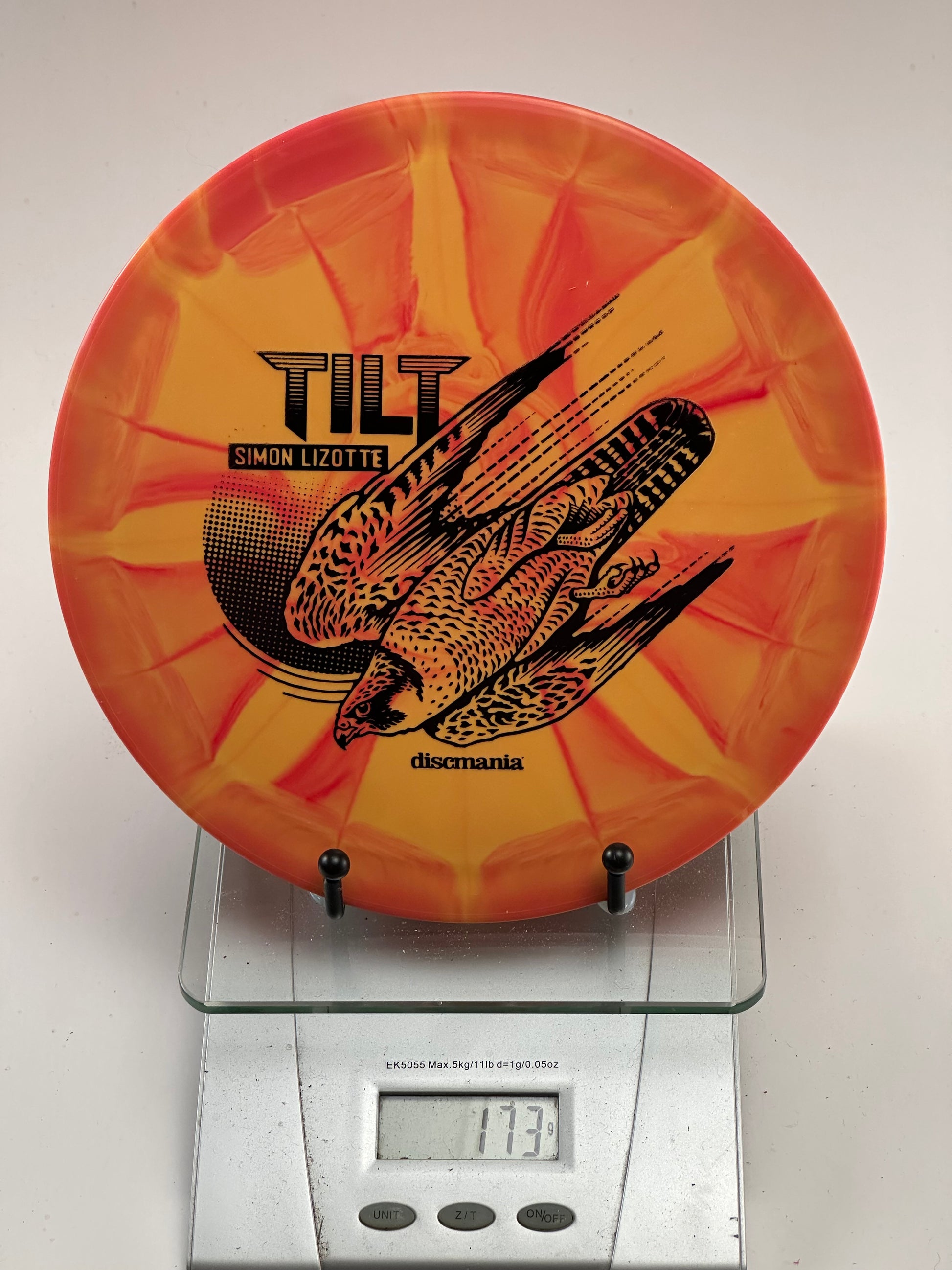 Discmania Tilt in Lux Vapor plastic, featuring an eye-catching red and yellow swirl pattern. Simon Lizotte Creator Series stamp. The disc appears to be in excellent condition.